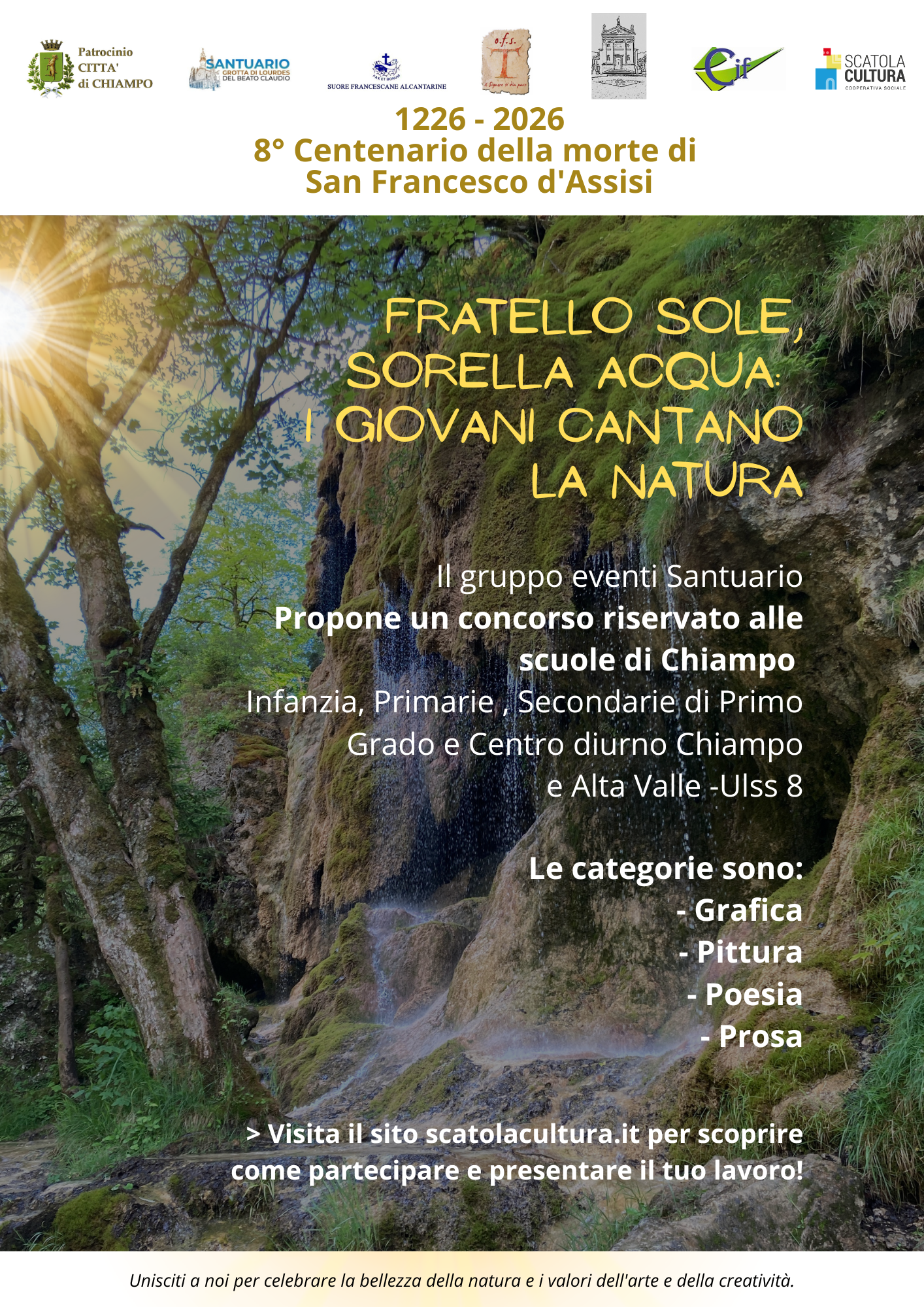 In occasione dell’ottavo centenario della morte di San Francesco d’Assisi, il Gruppo eventi Santuario di Chiampo (VI) propone un concorso riservato alle scuole di Chiampo e al Centro Diurno Chiampo – Alta Valle ULSS 8 per celebrare la bellezza della natura e i valori dell’arte e della creatività.